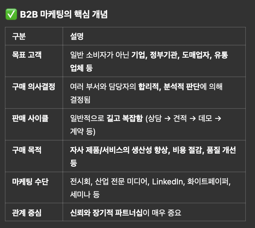 B2B 마케팅(Business-to-Business Marketing)은 기업 간 거래를 대상으로 하는 마케팅 활동을 의미합니다. 즉, **소비자(B2C)**가 아닌 다른 기업이나 조직을 고객으로 삼는 마케팅입니다.